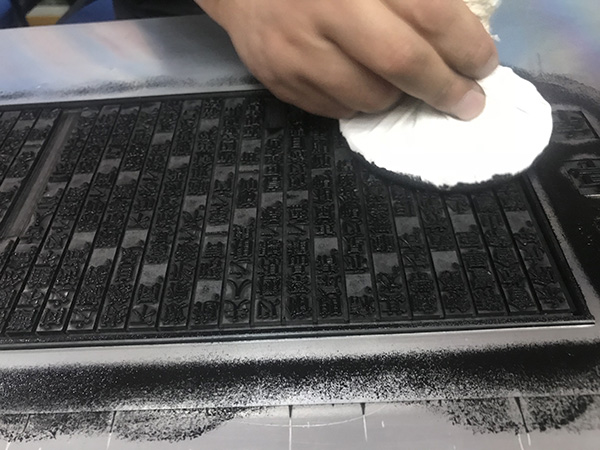 上海字模一厂副厂长刘现云演示拓印铅活字排版的《兰亭序》。
